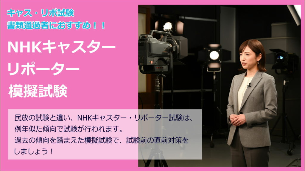 民放の試験と違い、NHKキャスター・リポーター試験は、例年似た傾向で試験が行われます。過去の傾向を踏まえた模擬試験で、試験前の直前対策をしましょう!