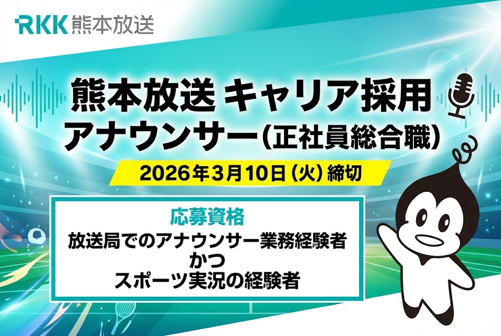 | 応募資格 | 放送局でのアナウンサー業務経験者 かつ スポーツ実況の経験者 ※スポーツ実況、またはそれに準ずるスポーツ業務の経験が必須です。 |